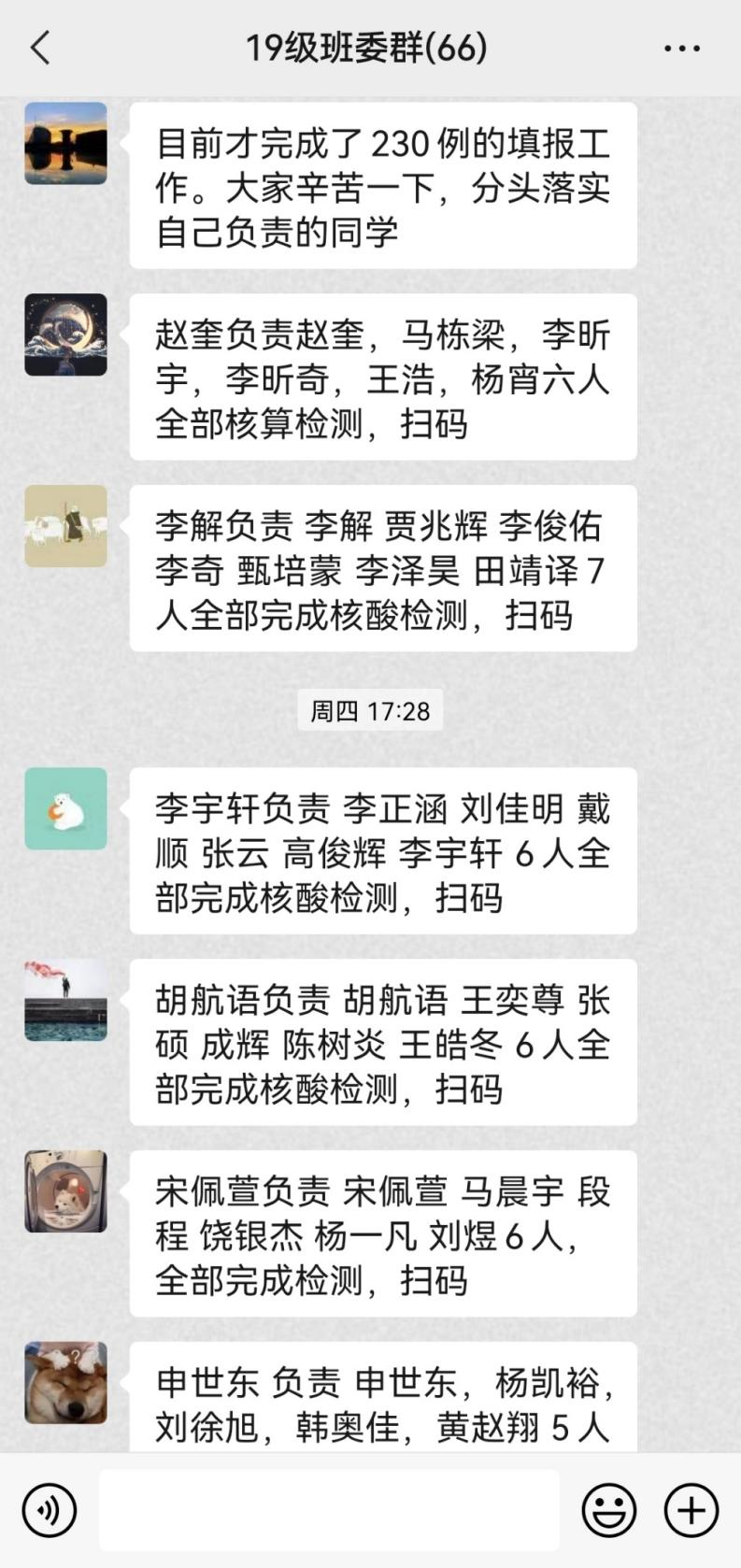 为了高效地开展疫情防控工作,辅导员梁韵基老师组织19级全体班委进行思想动员和工作部署,强调全体同学要有大局意识和集体意识,在关键时期,要充分体现员工干部的责任担当和奉献精神。同时,年级提出了人对人、点对点的精准疫情监控政策。全年级60余名班委,每人负责五名左右同学,实行精细化、全覆盖的疫情监测方式,保证全年级同学能够及时、严格地按照公司的要求进行核酸检测和疫情填报。在保障疫情防控的前提下,也关注同学们的心理健康,及时疏导同学的紧张情绪,并积极帮助那些心理有困难和生活有困难的同学。年级力求在全力配合好公司的疫情防控部署的情况下,确保每一位同学的身心健康,维护正常的在校学习生活秩序。