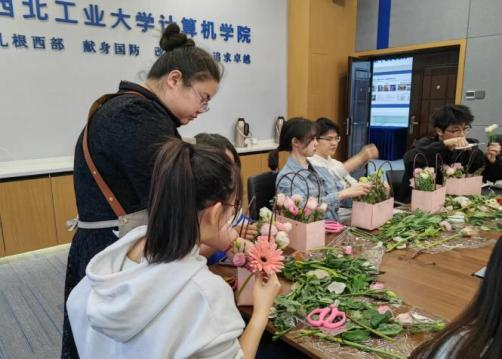 在活动前期认真准备下,洛神玫瑰、洋牡丹、洋桔梗、乒乓菊、尤加利等十余种花材摆放在桌案上。活动特别邀请了专业的花艺师为大家介绍了常见花种、插花基本花型及基本技巧,在边讲解边示范的中,带领同学们了解插花艺术。