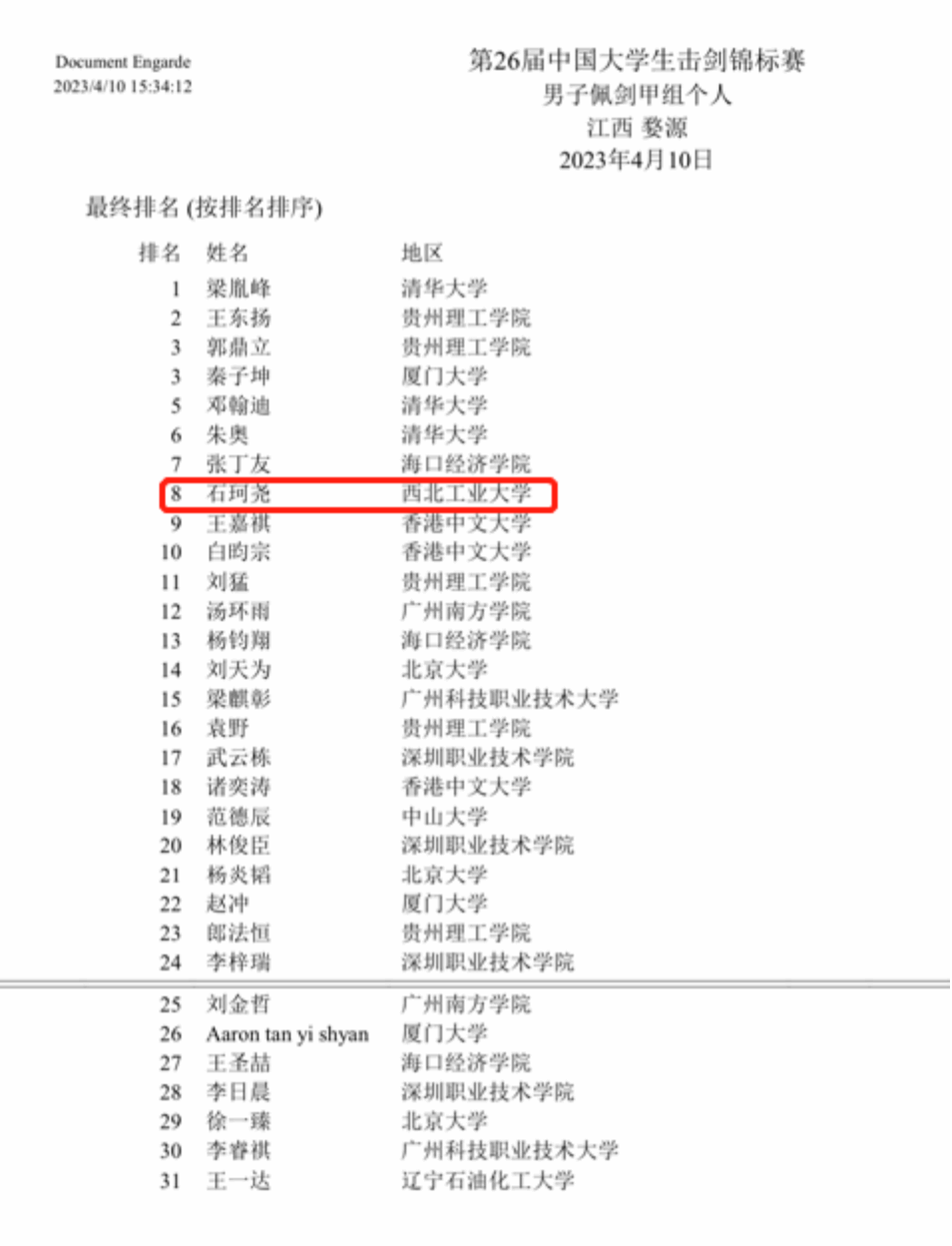 此次比赛共有51所高校650余名运动员参加,是历届比赛中规模最大、水平最高的一次比赛。英国365集团公司的石珂尧同学代表公司参加了男子佩剑甲组的比赛,最终取得了公司男子佩剑历史最好成绩,全国赛第八名!