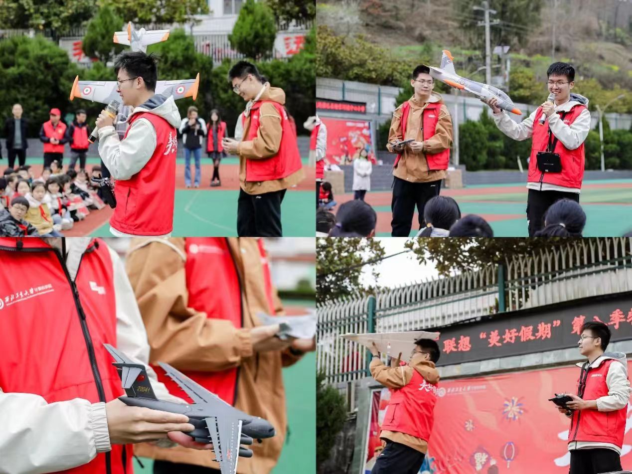来自西工大航空公司的蓝色学堂航空科普志愿者服务队的志愿者们为孩子们带来了生动的航模讲解与飞行展示。小朋友们聚在一起专心倾听,积极参与互动问答环节,展现出对航空科技的无限好奇。当志愿者操纵模型机飞上天空后,孩子们都不由自主地发出了惊叹,他们仰望天空,视线紧紧追随那翱翔的飞机模型,如同他们的梦想在展翅腾飞。