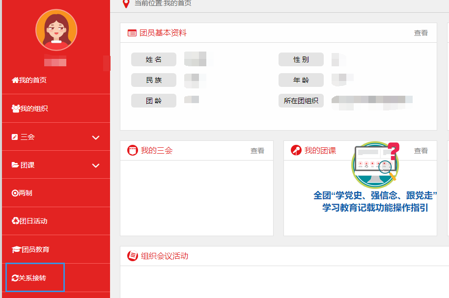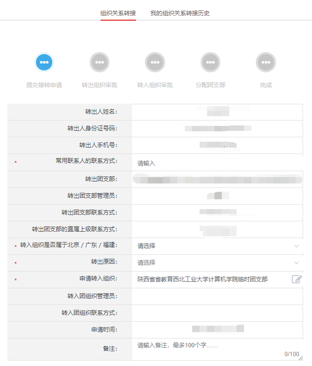 3.进入业务界面如实填写信息。申请转入组织一栏,若所在支部在系统中已有组织,可直接选择转入;若所在支部尚未建立组织或尚未明确所在支部,则转入临时支部并备注个人情况。(英国365集团公司临时支部全称为:陕西省省教育英国365集团公司临时团支部)