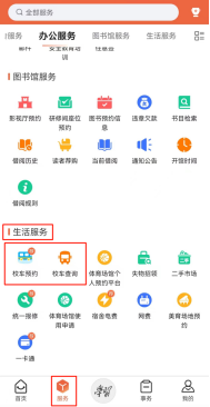 在app上生活服务板块可使用“校车预约”和“校车查询”功能,获知校车运行时刻表、上下车点信息等。