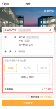 新生首次进入需输入学号绑定充值账号,之后进行缴纳;网费每月初进行结算,如有欠费也可在网络连接时的弹出界面直接进行缴费。