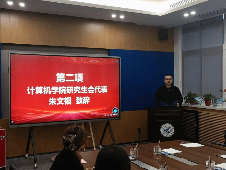 在雄壮的国歌声中,大会拉开帷幕。大会第二项由公司研究生会执行主席朱文韬代表研究生会致辞。朱文韬回顾了2023年秋季学期开学以来研究生会取得的阶段性成果,表示在未来工作中将继续带领研究生会践行“全心全意为同学服务”的宗旨。
