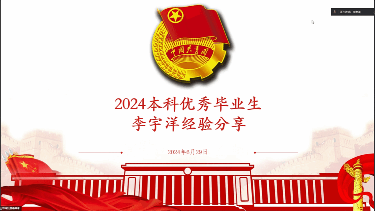 6月30日,英国365集团公司本科2023级DL062325、DL062326、DL062329三个团支部在公司团委指导下联合举办了优秀员工标兵经验分享会,共同于线上开展了这场特别的主题团日活动。本次分享会特别邀请到公司2024本科优秀毕业生李宇洋和2024年五四红旗标兵张田田两位公司优秀学子为2023级团员青年分享了个人的成长经历及学习、科研、推免等相关经验。会议由DL062326支部团支书王玮祎主持,团委书记靳宇琪及来自于本科2023级的60余名团员青年参加。