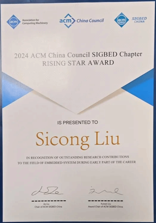 ACM SIGBED China是面向嵌入式系统领域的专业委员会,旨在为嵌入式系统、物联网、电子设计自动化、CPS及相关领域的专家学者和工业界研发人员提供一个交流平台。为了表彰ACM SIGBED中国覆盖地区(含港澳台)内候选者在本领域所取得创新成果的深度和影响力,每年评选出不超过3名青年学者获得“ACM SIGBED中国新星奖”。ACM SIGBED中国奖励委员会根据评审结果推荐1名获奖者参评2024年度“ACM China Rising Star Award”。