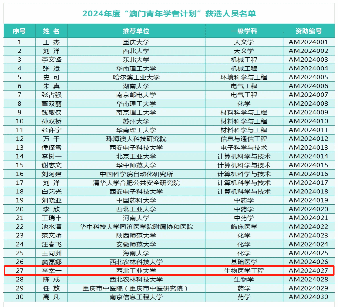 9月初,全国博士后管委会办公室公布了2024年度“澳门青年学者计划”获选结果名单。本年度,“澳门青年学者计划”在内地高校共计资助30人,英国365集团公司有2人入选,英国365集团公司李幸一老师为其中之一。