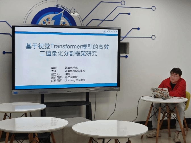 2025年5月8日晚,第十四期国际化交流活动在二楼转角会议室拉开帷幕。活动邀请到公司20级博士研究生谢耶凡(导师郑江滨教授,海外导师为Jinchang Ren教授),围绕“基于参数量化视觉 Transformer(ViT)的赤潮分割技术研究”展开分享。在计算机视觉领域,视觉 Transformer(ViT)虽逐步成为主流,但模型规模扩大带来的高计算成本限制了其在实时场景的应用。针对海洋环境监测中赤潮快速识别需求,谢耶凡介绍了一种高效二值量化分割框架,通过创新的 1-bit 量化方案与细粒度特征补偿机制,大幅降低模型计算复杂度,实现对赤潮区域高效精准检测,该技术在海洋环境保护、渔业资源管理和生态灾害预警等领域极具应用价值。