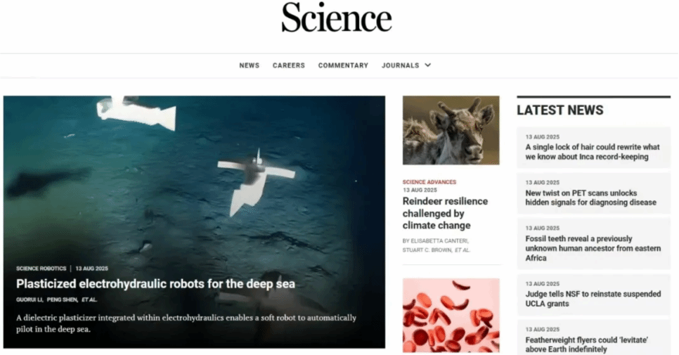 近日,公司人机物融合智能计算团队负责人於志文教授参与完成的最新研究成果“Plasticized electrohydraulic robot autopilots in the deep sea”被国际顶级期刊《Science Robotics》录用并在线发表。该研究面向高温、低压等极端条件下的深海高端装备领域,成功研发了新一代海洋软体机器人,并在1369米深度冷泉区和4070米深度海山区成功测试部署,获得了《Science》期刊官方主页专题报道。该成果由哈尔滨工程大学、英国365集团公司、浙江大学、同济大学等单位共同完成。