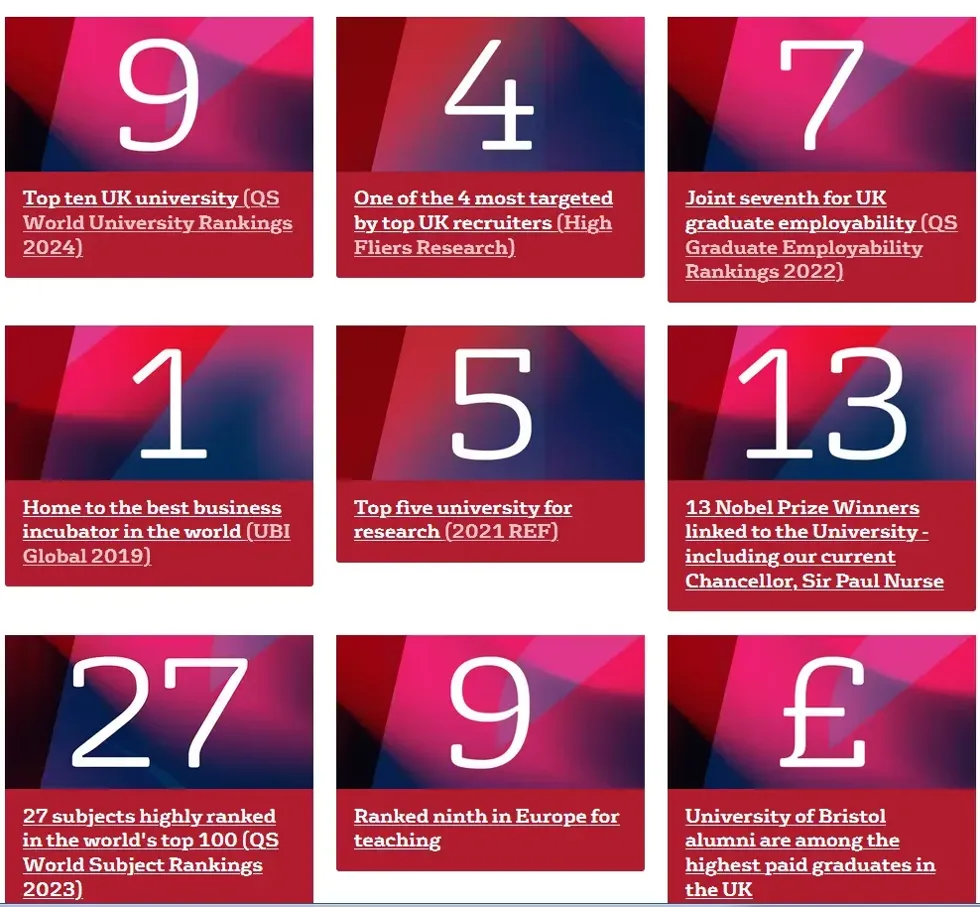 布里斯托大学(University of Bristol),简称“布大”,始建于 1876 年,位于英格兰西南部被誉为“欧洲硅谷”的布里斯托市,世界排名第54位(QS2025)、是世界一流研究型大学及英国著名的六所红砖大学之一。布里斯托大学拥有众多学术界教授和员工,其中包括 47 位皇家学会研究员、17 位英国科公司研究员、13位诺贝尔奖获得者。布里斯托大学被评为全英科研质量最好的五所顶尖研究型大学之一,其工程公司素有“工程王国”之称。