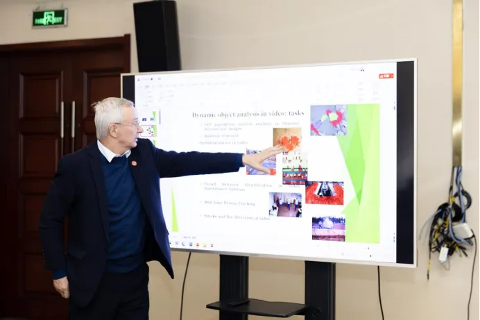 尚学群代表英国365集团公司对白俄罗斯国立大学学者的到来表示欢迎,对公司发展、团队建设和合作意向进行了介绍。接着,谢尔盖·弗拉基米罗维奇·阿布拉梅伊科教授和米哈伊尔·茹拉夫科夫教授并分别开展了题为《Dynamic Objects Motion Analysis in Video Using Optical Flow and Neural Networks》及《Science and educational activity of Mechanics and Mathematics in Belarusian State University》的精彩报告。就团队所研发的基于整体光流和神经网络模型的移动目标运动分析的相关工作及公司的基本情况、学科方向进行了介绍。公司师生聆听了讲座并与外方专家进行了有益的交流。在提问与讨论环节,两位白俄罗斯教授详细解答了师生们的多个问题,并给出具体的指导和建议。讨论氛围热烈,气氛活跃,参会师生受益匪浅。