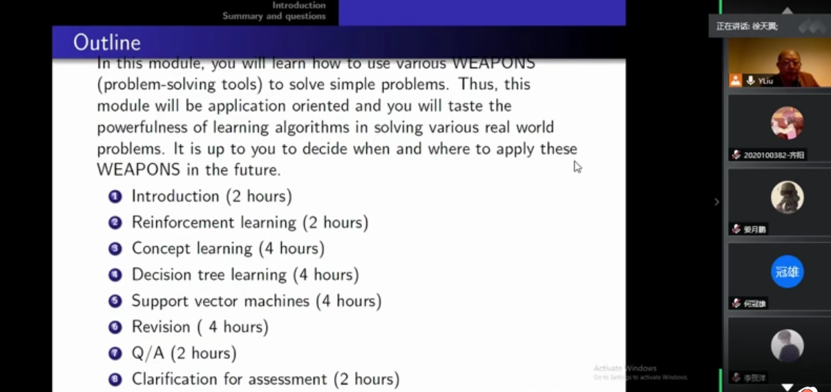2020年暑期国际学堂《Machine Learning(机器学习)》于7月13日正式开启线上课程。该课程由英国Edge Hill 大学可视计算中心主任刘永怀教授为员工们讲授。刘永怀教授的主要研究方向是三维计算机视觉、图像处理、模式识别、机器学习、人工智能和智能系统。目前是IEEE高级会员, 英国HEA( Higher Education Academy)的Fellow ,也是多个国际期刊和会议的主编或编委。在IEEE Transaction等顶级期刊和国际会议上发表论文180多篇。